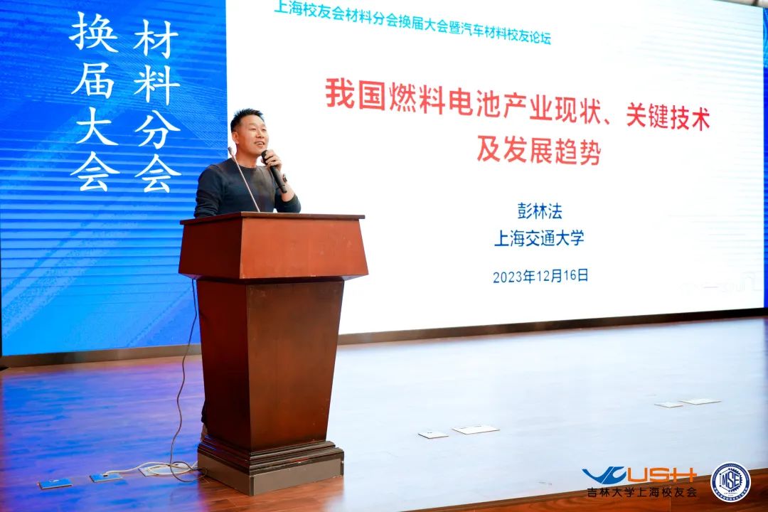 首先登台的是吉林大学材料学院2000届校友、来自上海交通大学的彭林法教授,他分享的题目是《我国燃料电池产业现状、关键技术及发展趋势》,彭教授通过深入浅出的语言,让大家了解了当前非常热门的燃料电池行业发展状况。