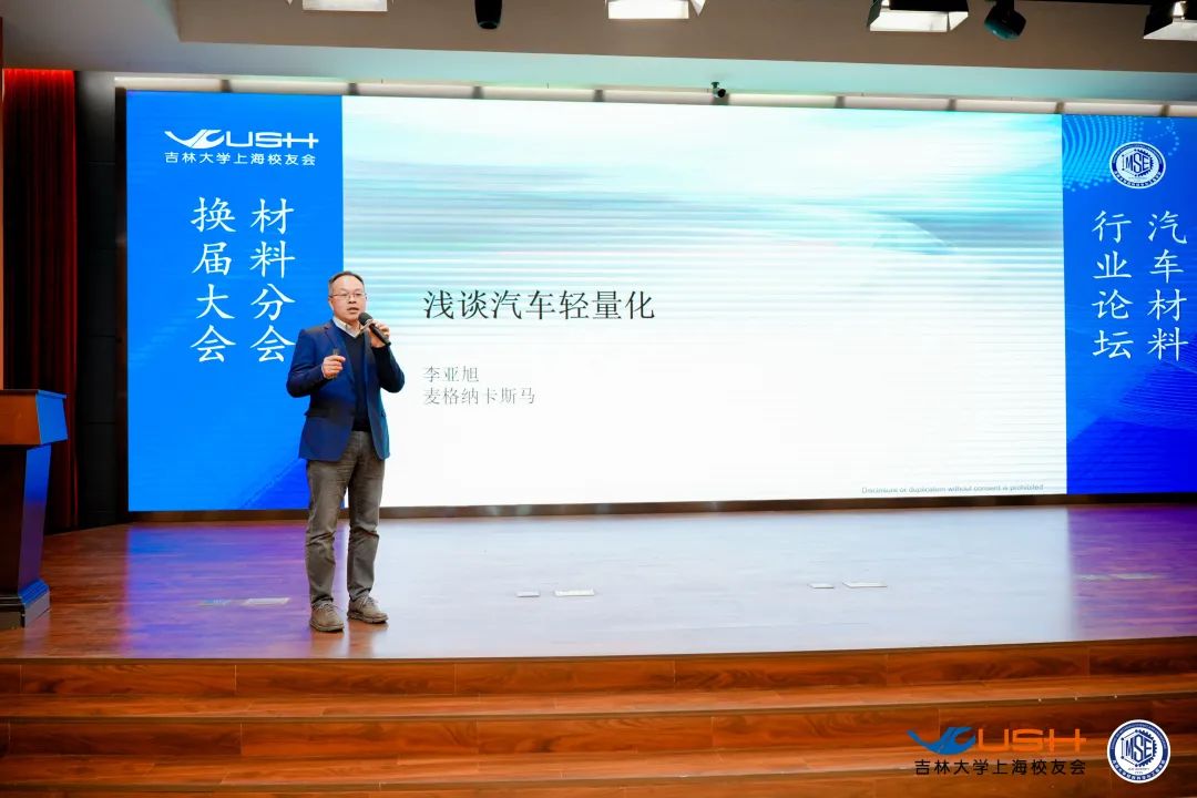第二个出场的是材料学院96级校友、麦格纳集团车身与底盘(卡斯马)事业部中国区副总裁李亚旭,他给大家分享了《汽车轻量化浅谈》报告,介绍了国、内外汽车厂商通过优化材料、工艺等实现汽车零部件轻量化的途径以及各自的优缺点,参会的听众都觉得受益匪浅。