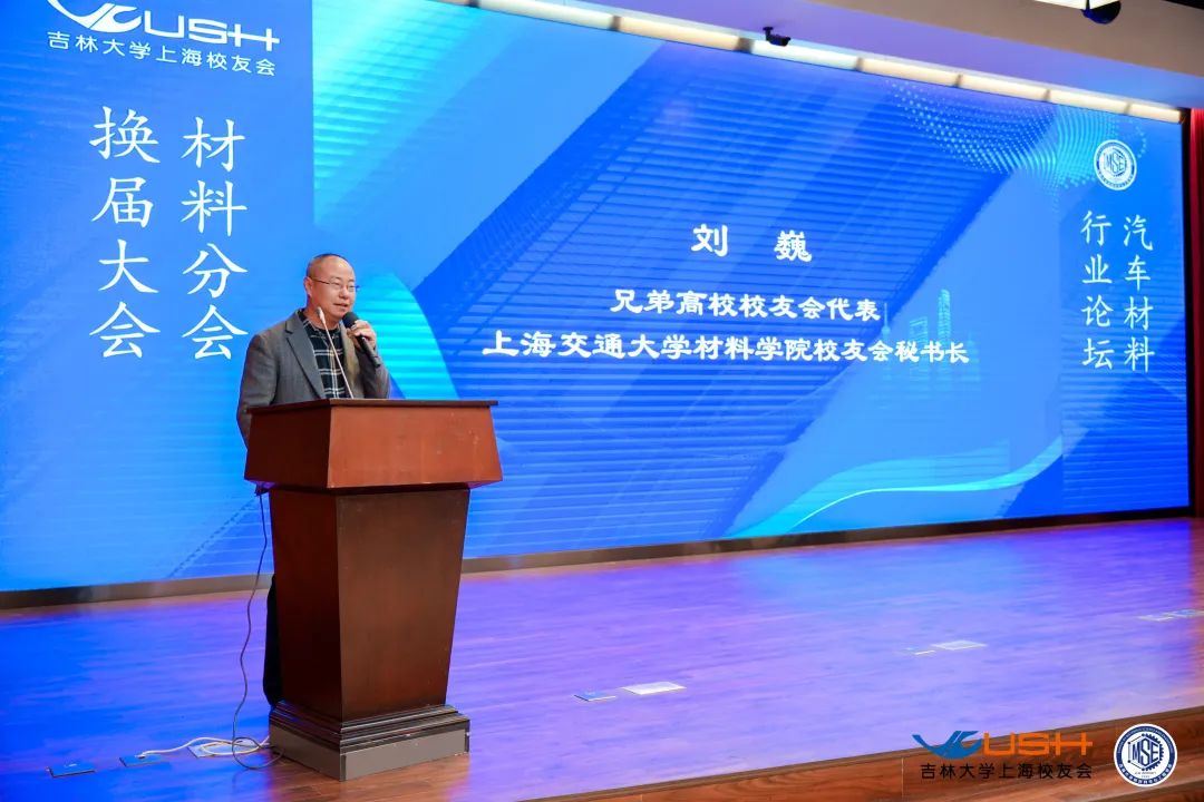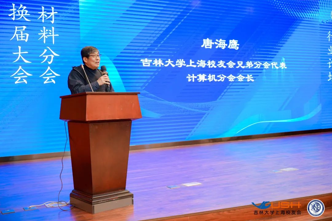 会议第四项,专程到场祝贺本次大会召开的兄弟社团组织代表,上海交通大学材料学院校友会秘书长刘巍和吉大上海校友会计算机分会会长唐海鹰先后登台致辞,都对本次换届大会的成功举办表示祝贺,并表达了今后与吉大上海校友会和材料分会加强交流、紧密合作的意愿。
