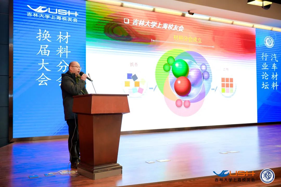 首先,吉林大学上海校友会常务副会长兼秘书长王洪俊致辞,他代表上海校友会热烈欢迎母校老师、各位来宾和各地校友的到来,并简要介绍了上海校友会的概况及材料分会换届的背景情况,表示今后上海校友会将一如既往地支持材料分会的发展,希望广大校友多多关注材料分会、多多关注上海校友会。
