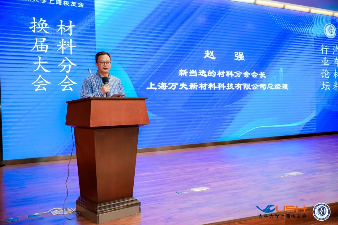 会议第五项,新当选材料分会会长的94级校友、上海万夫新材料科技有限公司总经理赵强代表新一届材料分会班子成员上台发言,他首先感谢材料学院、上海校友会和广大校友对新一届材料分会组织成员以及他本人的信任,表示一定不辱使命,今后会与其他材料分会班子成员一起努力把工作做好,为校友们提供更多、更好的服务。