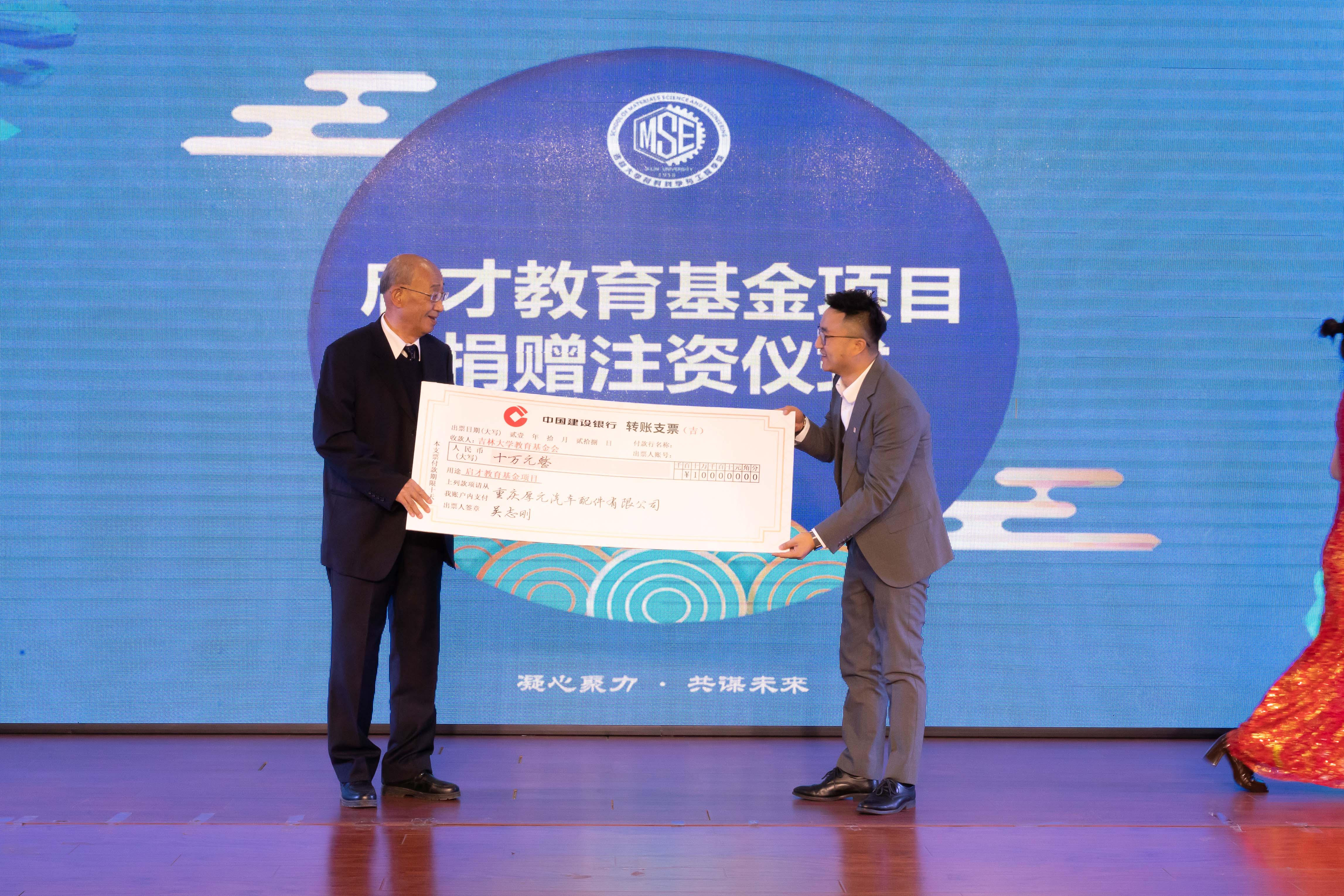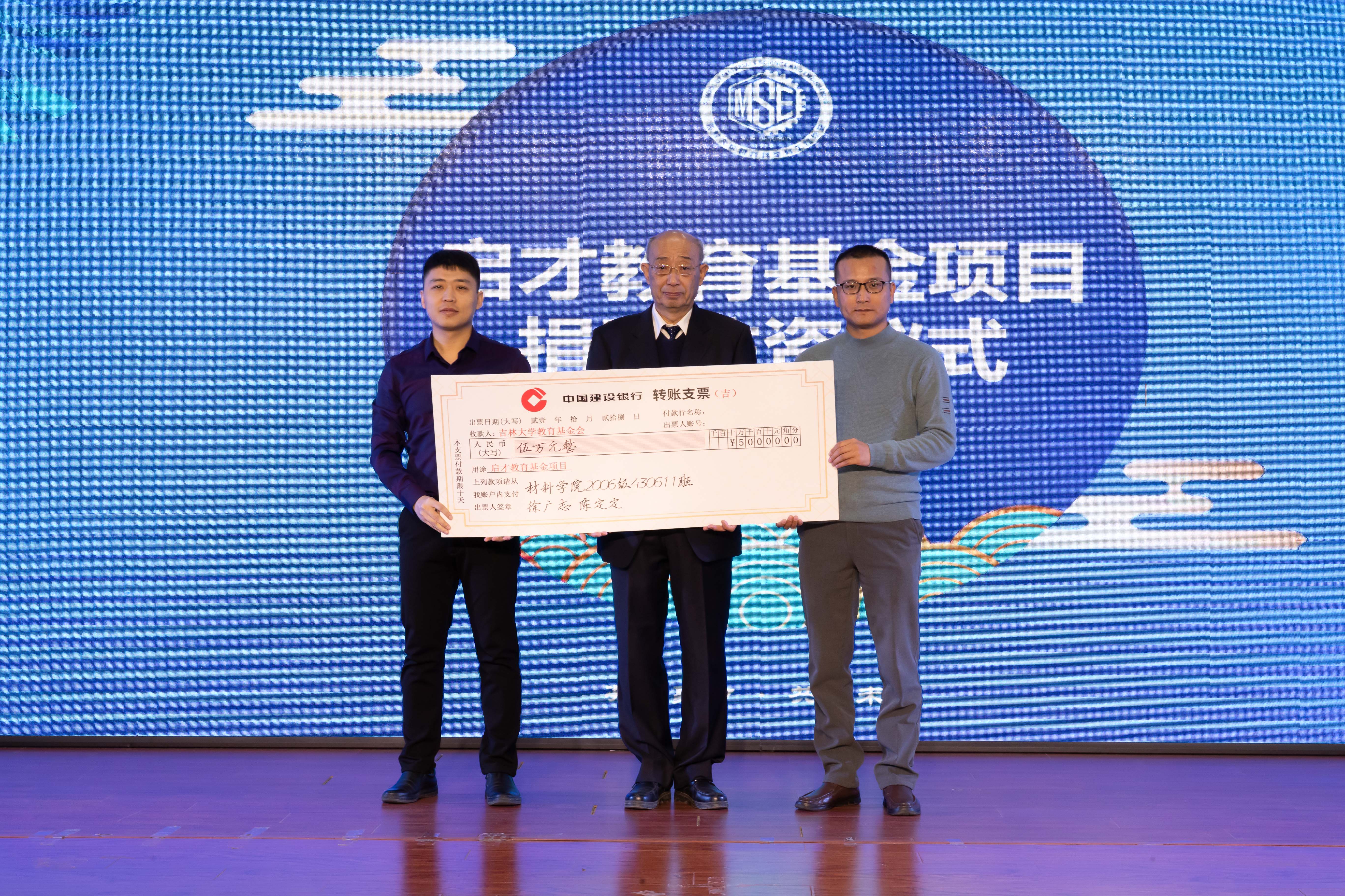活动第三项进行启才教育基金项目捐赠注资仪式,首先由姜启川教授同吴志刚、徐广志和陈定定校友共同为启才教育基金注资,随后姜老师表示要以培养出德智体美劳全面发展的接班人为宗旨鼓励更多的校友为学院建设做出更大贡献。