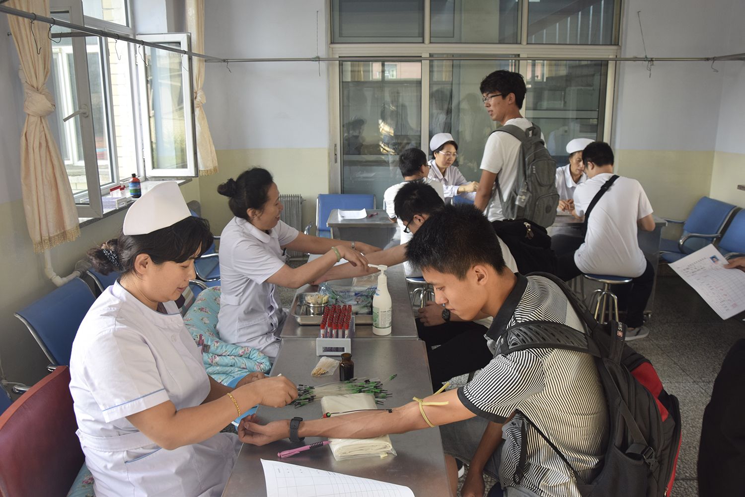 28日、29日上午8:00,全体新生于宿舍公寓楼下集合完毕,随后由辅导员助理及班主任助理带队前往校区医院接受体检。本次体检设有心压、心率、身高、体重、视力、听力、口腔、胸透等多个项目。在学校的合理安排下,在医院医护人员的认真检查、辛苦付出下,在同学们的积极配合下,体检工作得以迅速有序的展开。上午11:30 新生们顺利地完成了所有的体检项目。