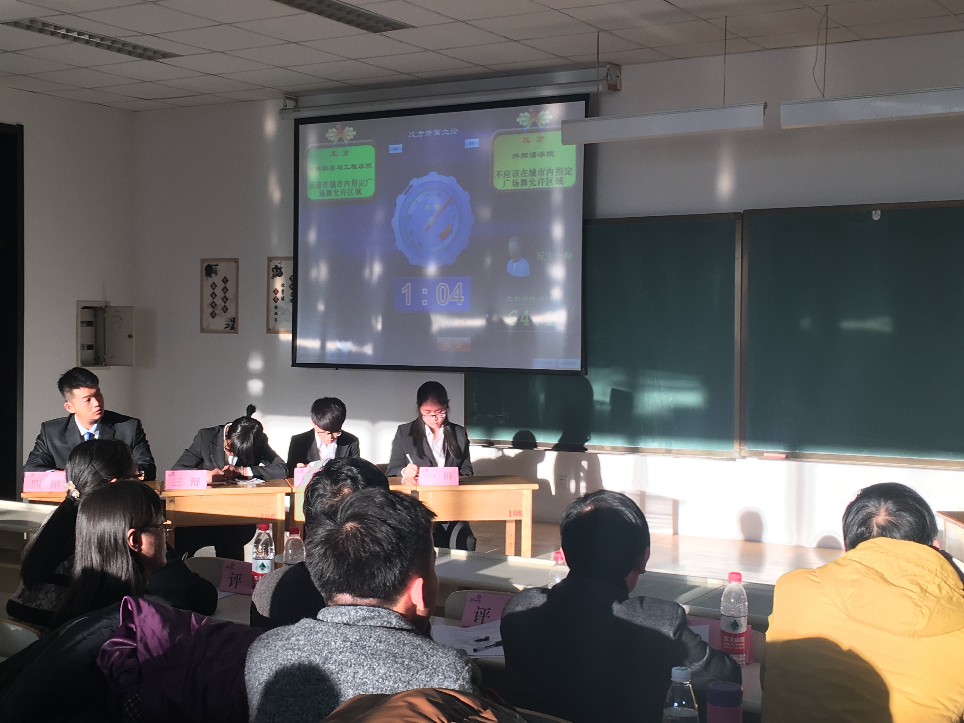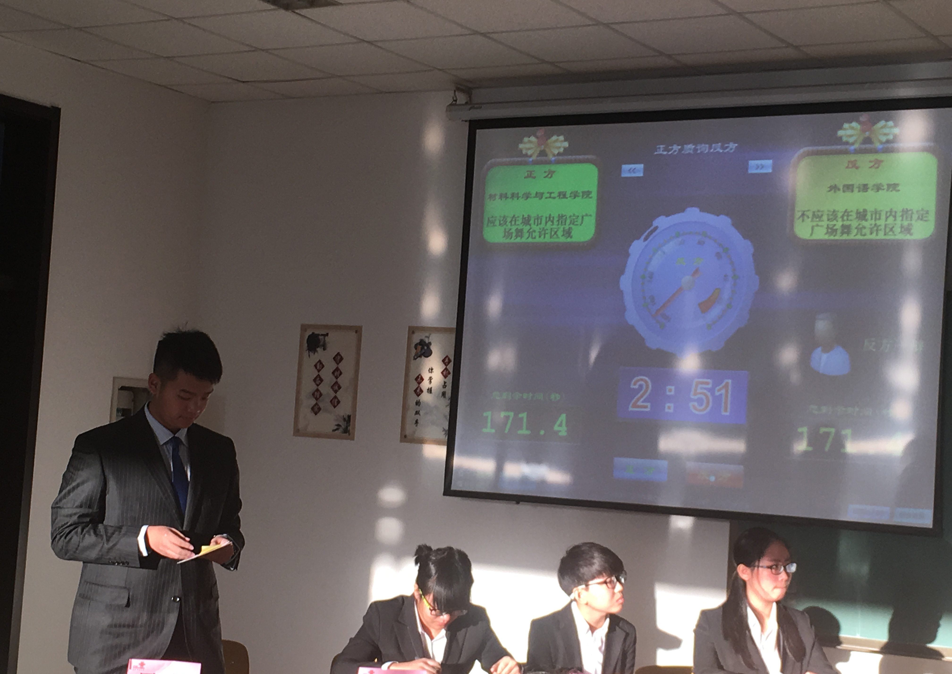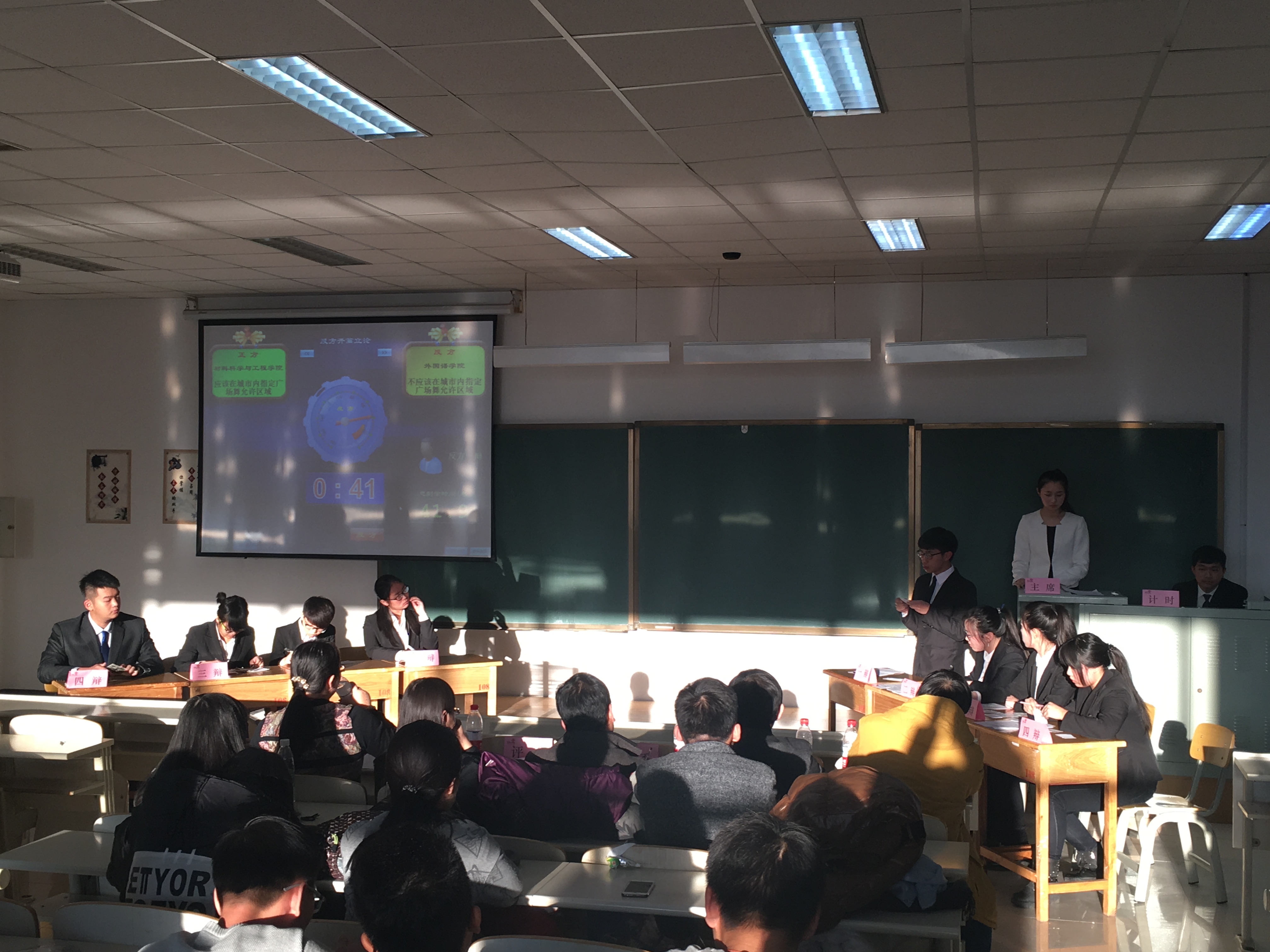 代表正方“应在城市内指定广场舞允许区域”,外国语学院代表反方“不应在城市内指定广场舞允许区域”。首先,在开篇立论环节,正方一辩围绕近年来关于以广场舞为代表的城市精神文明建设展开论述,系统地阐述了在城市内指定广场舞允许区域的益处。在反方一辩发言之后,正方四辩紧抓对方语言中的漏洞,对对方的不合理之处进行了激烈的辩驳。随后的质询环节,正方二辩、三辩发挥精彩,不仅对对方的质询进行有力的还击,还从中国城市精神的发展这一角度进一步论证观点。随之而来的自由辩论环节,正方辩论队四位辩手,措辞精准,条理清晰,论据翔实,虽然稍有失误,但依旧对对方辩友进行了有力的攻辩,展现了辩手们出色的口才。最后,双方四辩总结陈词,对对方辩手在辩论过程中的漏洞进行攻辩,并再次强调己方所持观点。最终,我院代表队惜败对手,但双方辩手依旧给在场观众留下了深刻的印象,呈现出一场精彩绝伦的比赛。