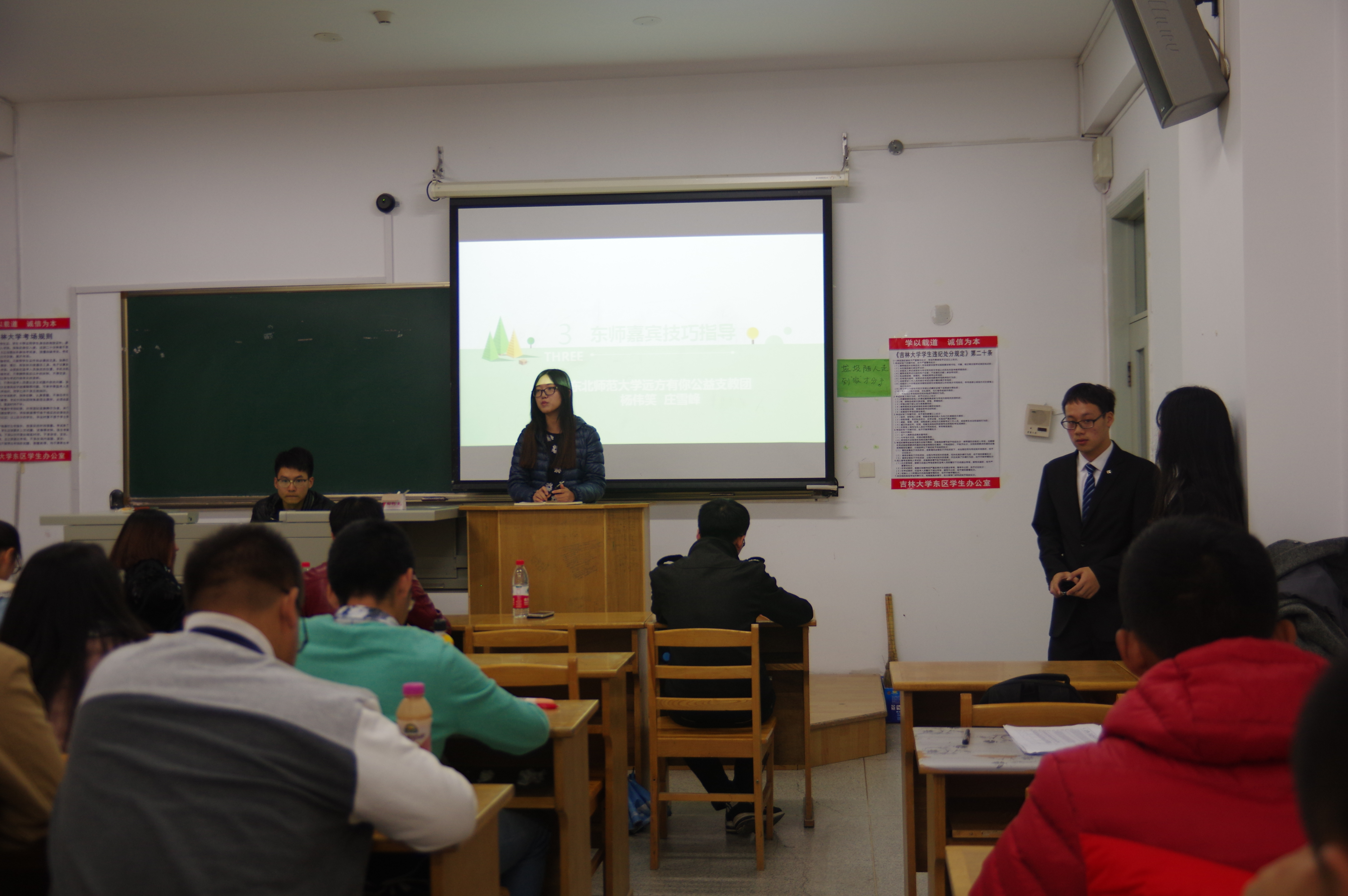 活动伊始,主持人对嘉宾进行了介绍。阳光爱心学校副校长张龙华向2016级23名爱心教师表示热烈的欢迎,并用支教视频向在场的同学展示了爱心教师的职责。随后东北师范大学杨伟笑和庄雪峰对爱心教师讲授了支教经验和技巧,指导三位爱心教师进行现场试讲,他们表现活跃,应变能力强,获得了同学们的称赞和掌声。最后,支教处部长王宝阐明了支教处与众多爱心教师坚持支教的目的与意义。整个活动过程中精彩不断,掌声迭起,一段传递爱的视频为整个培训会画上完美句号。