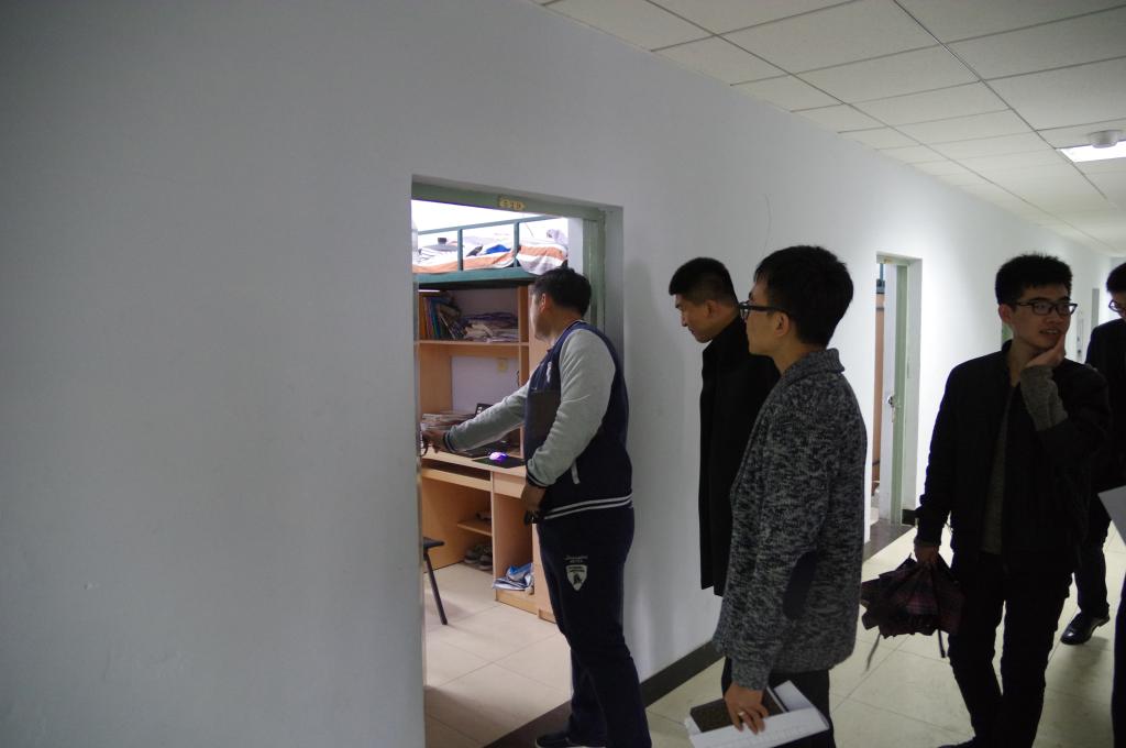活动在十一公寓展开,李书记和老师们首先走访了2013级学生的寝室,并和他们亲切交谈,在访问过程中发现,学生精神状态很好,学习与寻找工作进展顺利,寝室卫生普遍情况较好,个别寝室存在卫生不合格现象,张老师对这些寝室的学生进行了督促。随后对学生二公寓进行了走访,因2014级学生寝室较小,物品较多,摆放存在问题,但学生寝室依然干净卫生。在对十三公寓2015级学生寝室的访问中,李书记和佟老师均表示满意,学生在行为表现、寝室卫生及物品摆放上普遍表现良好。在此次检查中2016级学生表现最为突出,同学们文明礼貌,寝室干净整洁,装饰丰富多彩,将寝室装扮出家的感觉。