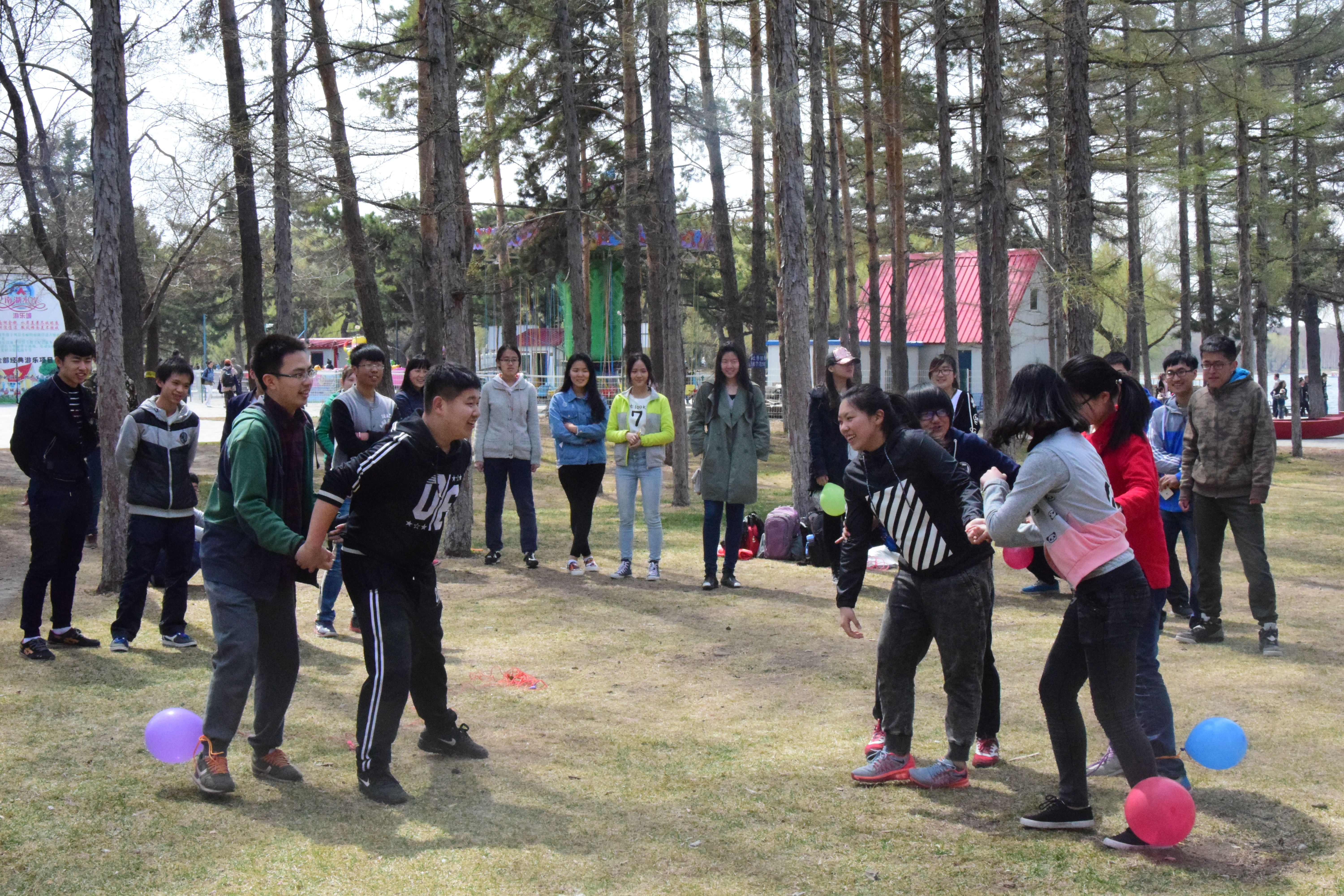活动在“默契游戏”中拉开帷幕,每组两人分别站在遮挡布前后,并改变自己位置,布被撤掉后由前面的人背起身后的人,若为同组,迅速跑到指定地点解开绳子,若不同组要尽力阻止其完成任务,在考验默契的游戏中拉近学生之间的距离,使大家逐渐融入到活动中。接下来的游戏名为“穿越雷阵”,被蒙上眼睛的队员在同伴的牵引下穿越由其他同学组成的“雷阵”,这需要队员对同伴的充分信任。“指压板接力赛”要求两人一组,翻越障碍,到指定位置挤破气球,并在指压板上共同完成十次跳绳,用时最短者胜利,让大家在欢笑的基础上,懂得了团队合作的可贵。最后进行的游戏叫做“踩气球”,每组需要踩对方的气球,同时保护好自己的气球,气球未爆的一组胜利,这项游戏考验了同学们团队合作的能力。游戏之后,由负责人总结讲话,大家打扫活动场地,清点人数,之后共同返回学校。