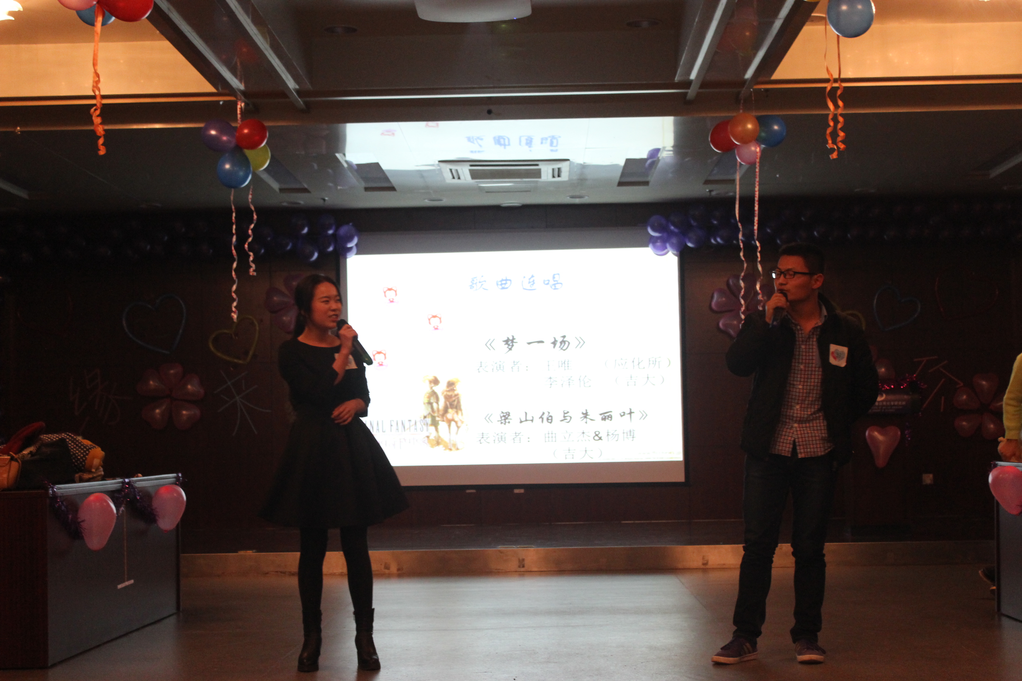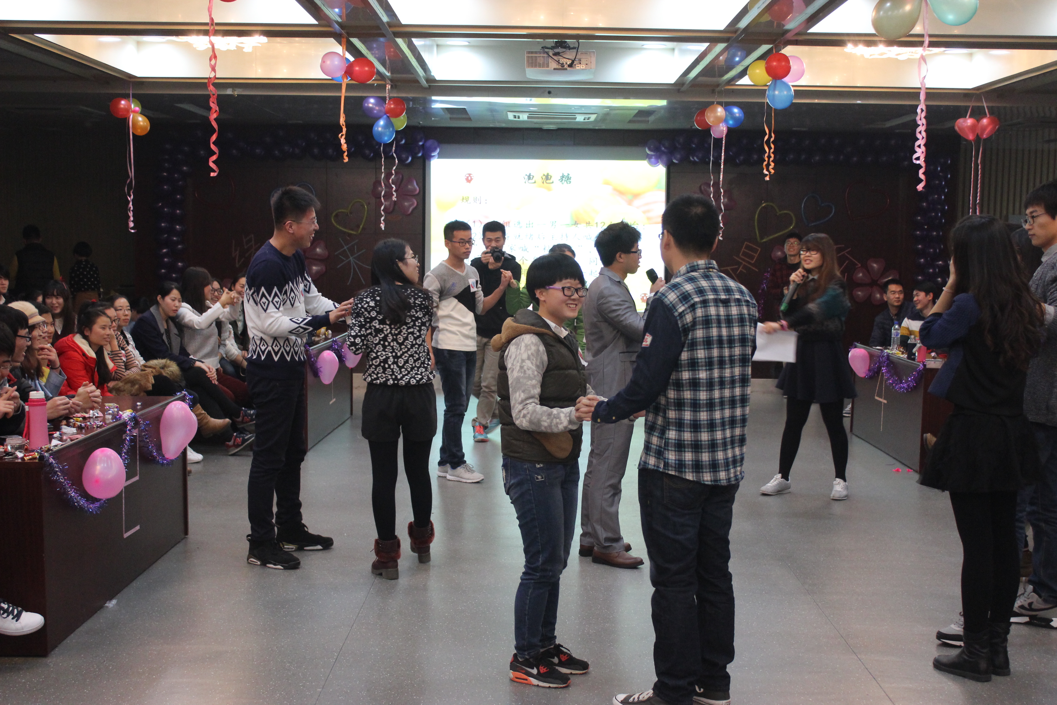 活动在开场舞《sarvar》欢快的节奏中拉开序幕。整个活动分为“遇见你,认识你”、“认识你,了解你”、“了解你,爱上你”、“爱上你,在一起”四部分,在场学生分成六个组进行游戏。《听音乐猜歌曲》要求每组派两名选手参赛,选手依据播放的音乐说出歌名,并即兴演唱,各组选手争相抢答,充分展示自己音乐实力,现场气氛异常激烈;随后而来的舞蹈《feedback》及《up and down》使会场气氛迅速升温,成为活动现场一道靓丽的风景。紧接着由我院研究生带来的歌曲《梁山伯与茱丽叶》,以及吉大化学学院和应化所研究生联袂演唱的《梦一场》为活动增添了几份温馨与浪漫,选手们出色的表现赢得在场观众的阵阵掌声。游戏《泡泡糖》比赛中参与者新奇而大胆的动作引起阵阵惊呼,使活动现场气氛达到顶峰。在爱上你,在一起环节里我院两名研究生演唱了歌曲《有一点动心》。在同学们不愿离去的呼声中,主持人临时决定增加游戏《猪八戒背媳妇》,联谊会变成了欢乐的海洋,全场气氛再次被推上了高潮。活动最后,现场学生在发放的心动卡片纷纷写下自己心仪的男(女)生编号。在《两个人的荒岛》的歌声中,伴随着每个人心中的美好愿景,本场青春联谊会最终缓缓落下了帷幕。