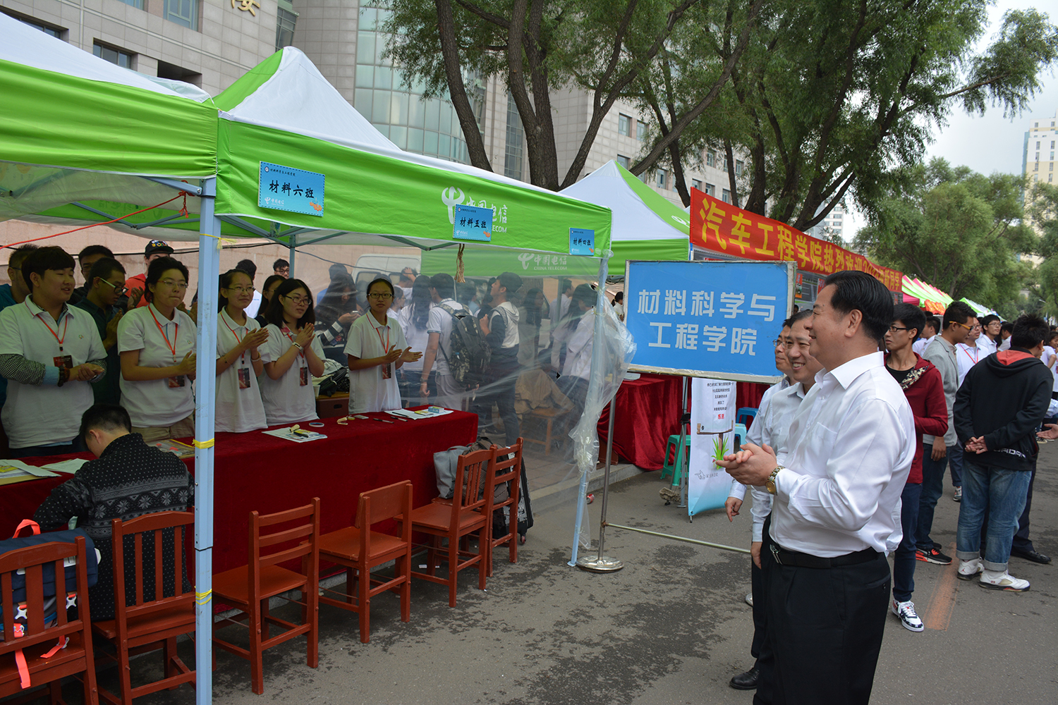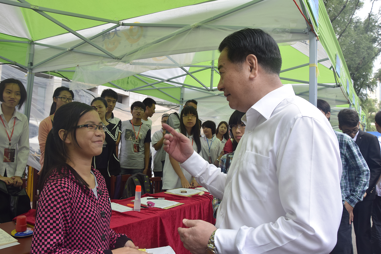 校领导一行人受到了15级新生和在场志愿者们的热烈欢迎。校领导首先询问了我院2015级辅导员滕亚廷迎新工作的开展情况,并与新生热切交谈,关切地询问新生家乡近况,是否能适应新的大学生活等问题,鼓励新生在大学里勤学慎思,踏实求是,并以“求实创新,励志图强”的校训寄托对新生的期望。校领导还亲切地问候了在场值班的志愿者们,赞扬志愿者们为学校做出的贡献,期望志愿者们展现出我们吉大学子优良的精神风貌,并同志愿者一一握手。志愿者们受到了极大的鼓舞,以更加饱满的热情投入工作。最后校领导与新生和全体志愿者合影留念,并嘱托志愿者们要认真做好迎新工作。