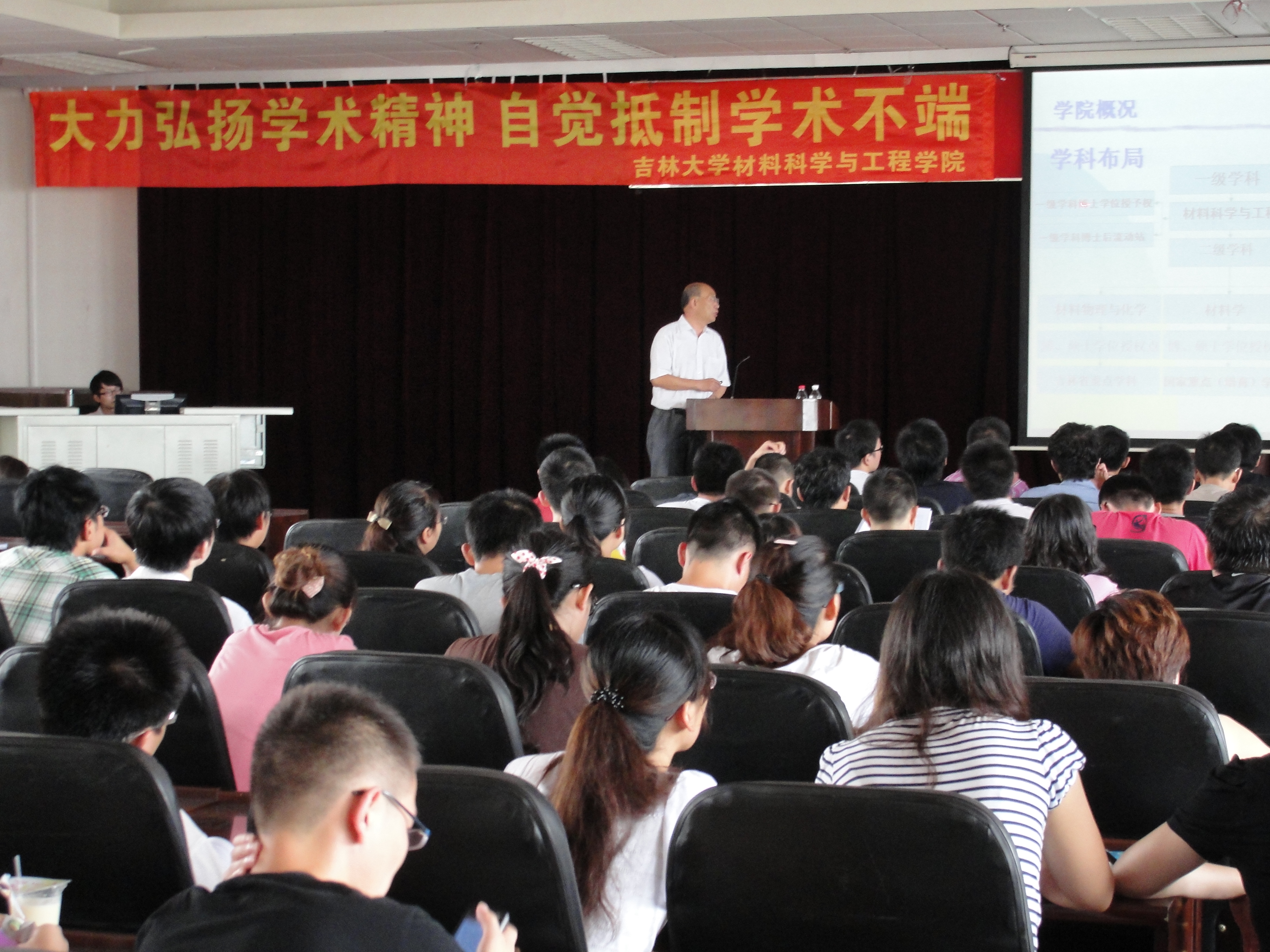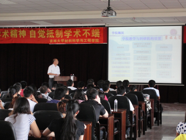 姜教授首先对大家来到材料学院进行深造表示祝贺和欢迎,之后从宏观上和自身课题组两个角度向大家简单介绍材料学院专业设置、辉煌的研究成果、强大的师资力量和高水平的研究能力,使大家对材料学院有了更多了解。随后姜教授从三个方面向大家讲解如何坚守学术道德,加强学风建设。第一个方面:做学问要先学会做人,他以自身课题组的硕士邓刚的研究成果对国民经济的做出重要贡献为例教育大家要有使命感,责任感,要有正确的人生观、价值观和崇高的理想;第二方面:学会做事,做任何事都要诚信守法,懂得奉献,团结互助,与人为善;第三方面:如何做学问,教育大家要有强烈的求知欲,有创新精神,有拼搏进取、百折不挠的精神。最后姜教授对大家提出了希望,希望大家努力历练,培养素质,成为德智体全面发展的人,成为国家的栋梁之才。