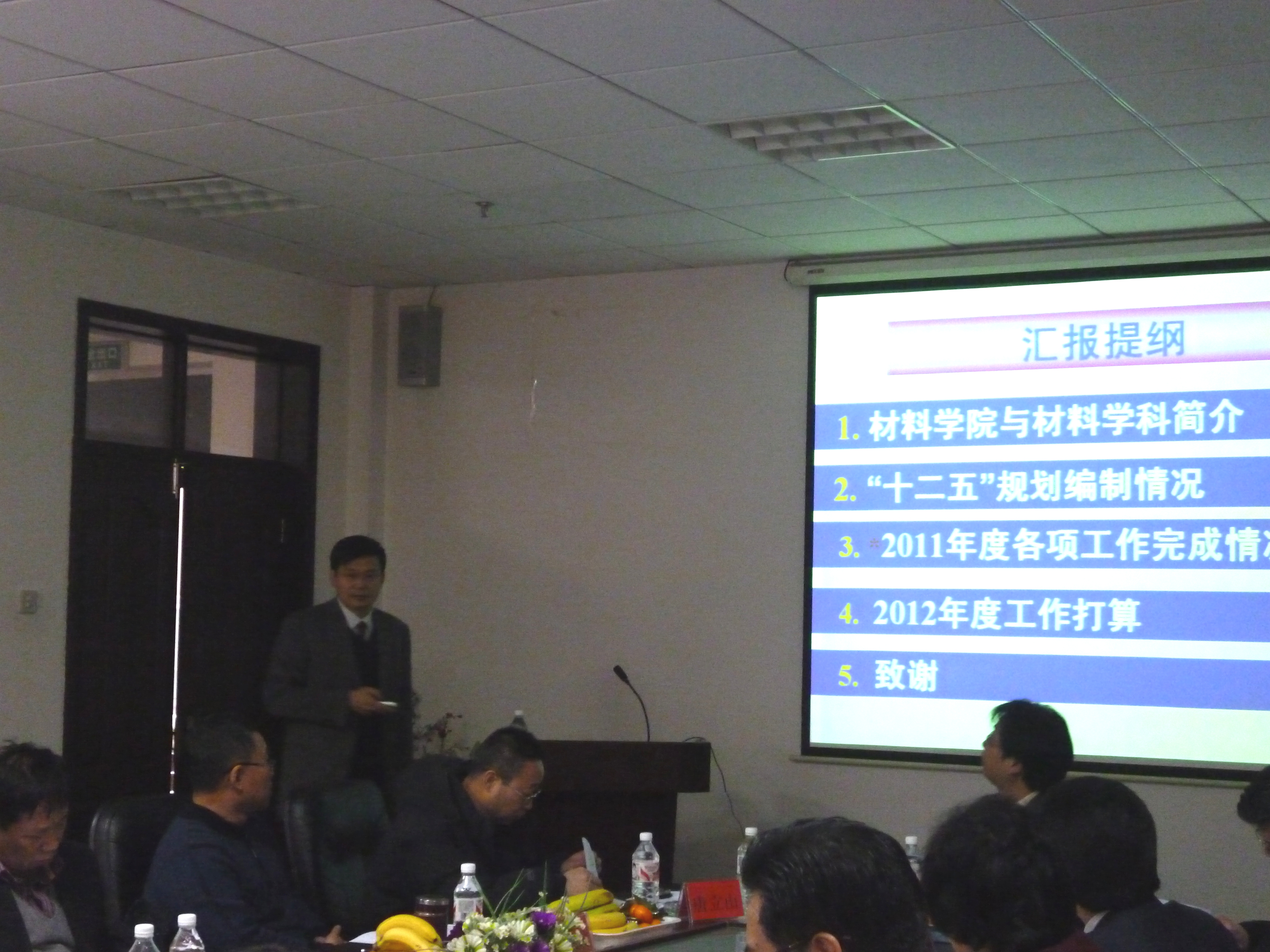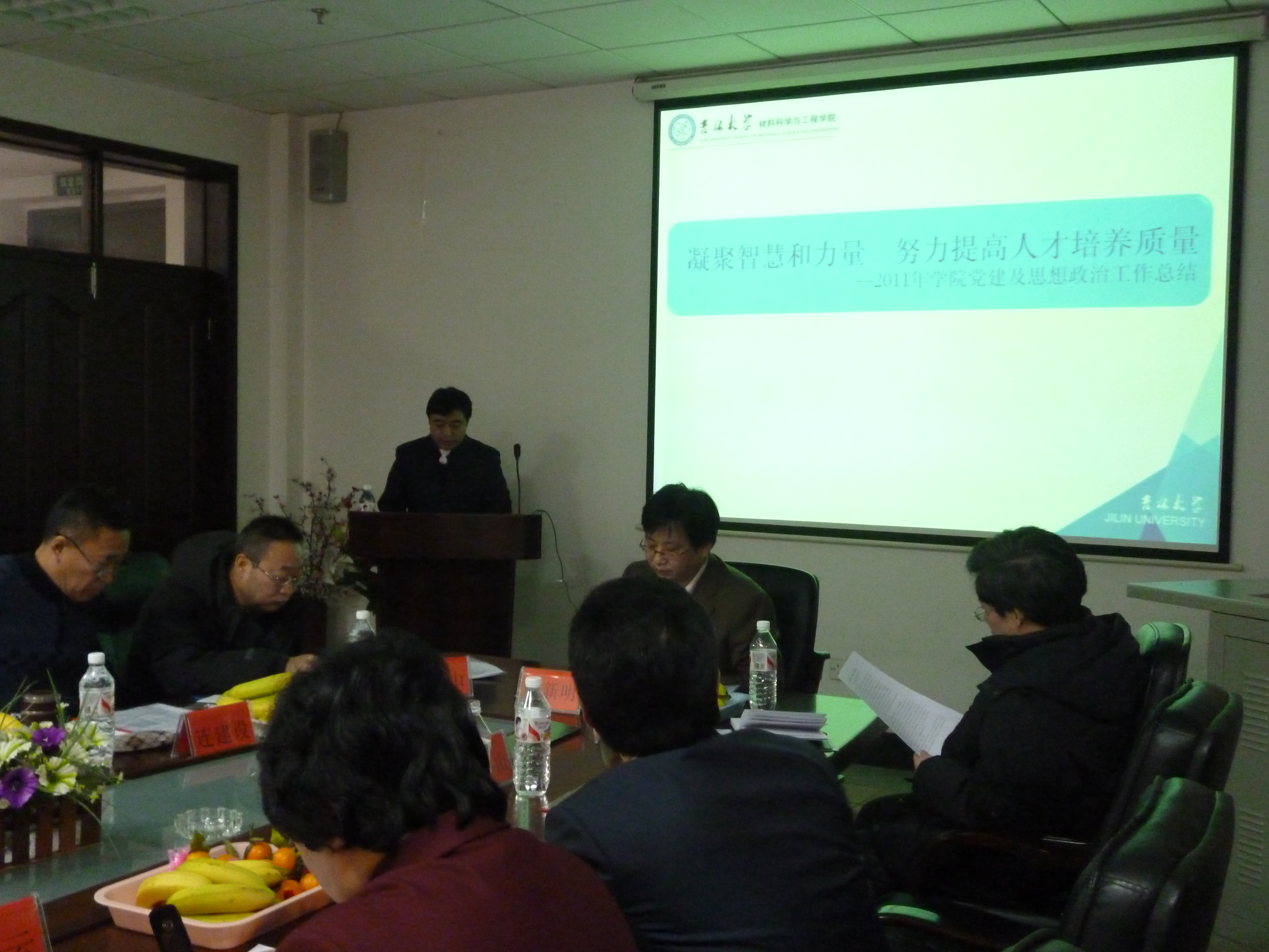 为贯彻落实《关于进一步深化学校管理体制改革的若干意见》精神,全面总结“十二五”开局之年的各项工作,进一步掌握年度工作目标完成情况并及时了解学院相关重点工作的推进情况,按照学校对2011年度工作进行检查调研的总体安排,2012年1月10日下午2点,在材料馆410会议室,材料学院召开了2011年工作总结汇报会。李元元校长亲临指导,常务副校长赵继教授、宋玉泉院士、校办主任刘桂云、第二检查调研组全体成员,材料学院党政班子成员、二级教代会代表、学术委员会委员、学位评定委员会委员、教学工作委员会委员、党支部书记、学生代表出席会议。会议由行政副院长、二级教代会秘书长吴新明主持。