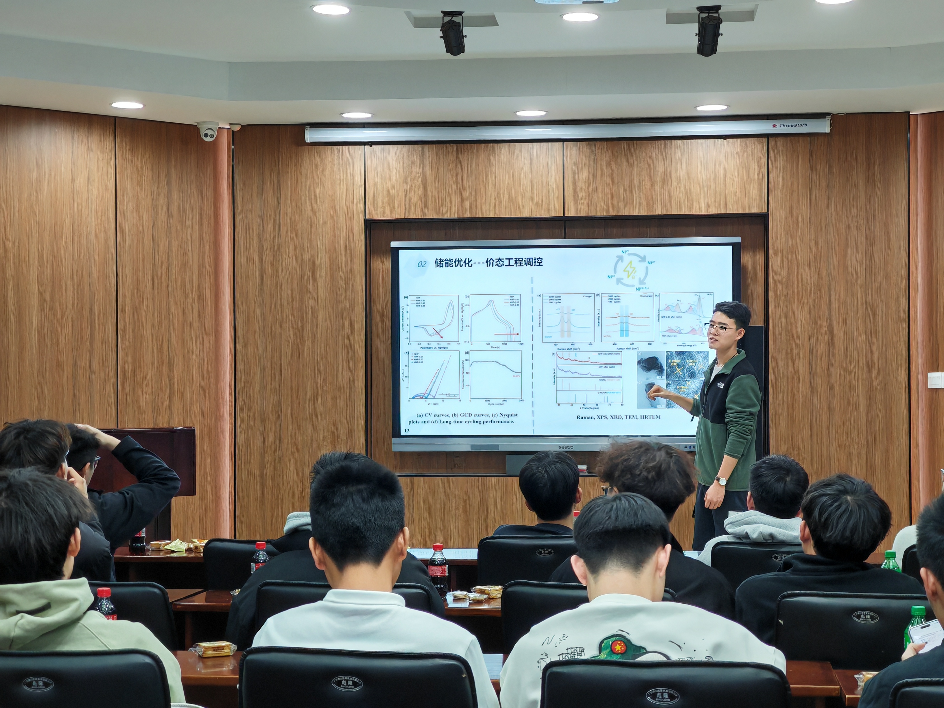 赵禹曈同学分享的主题是羟基氟化镍电极材料的设计及应用,过渡金属羟基氟化物作为一种新型的电极材料,因其具有较高的理论比容量以及优异的电化学性能而受到业内学者的广泛关注。本报告以羟基氟化镍作为电极材料,提出铁掺杂调控价态的策略:引入Fe元素优化电子结构,降低电子转移阻力并诱导高价态Ni3+δ的产生,丰富氧化还原过程,有效增强储能。由该材料组装的柔性非对称型超级电容器,具有112.6 Wh kg-1的高能量密度。此外,Fe、Cr双元素掺杂作为电子供体提高电化学性能,复合石墨烯成功解决稳定性差的问题,可以达到双优化的目的。