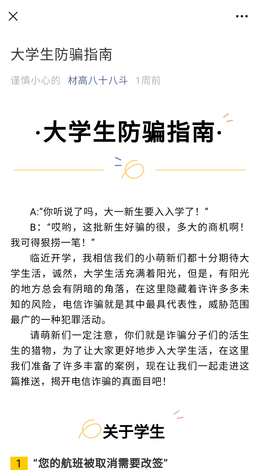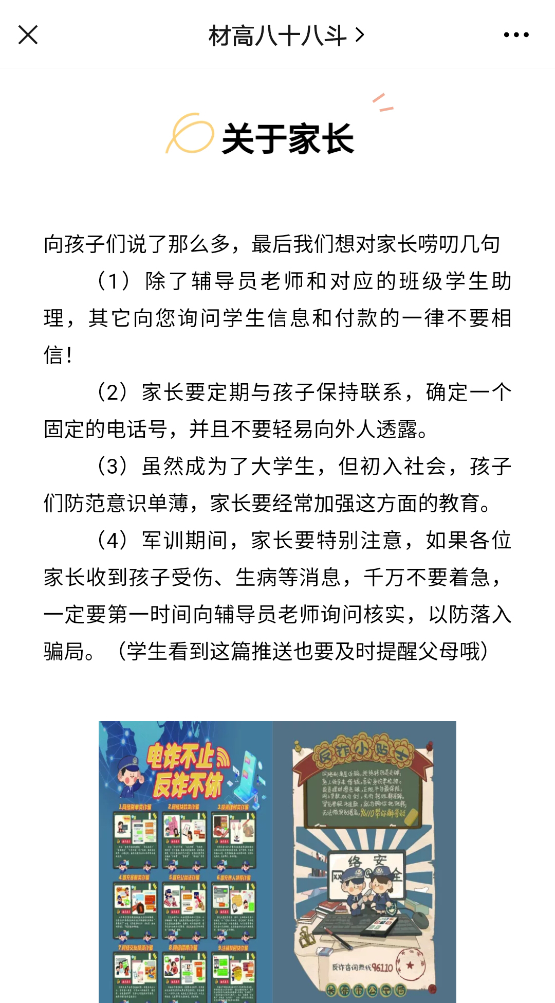 借助微信公众号“材高八十八斗”进行了新生防骗宣传的线上活动。
